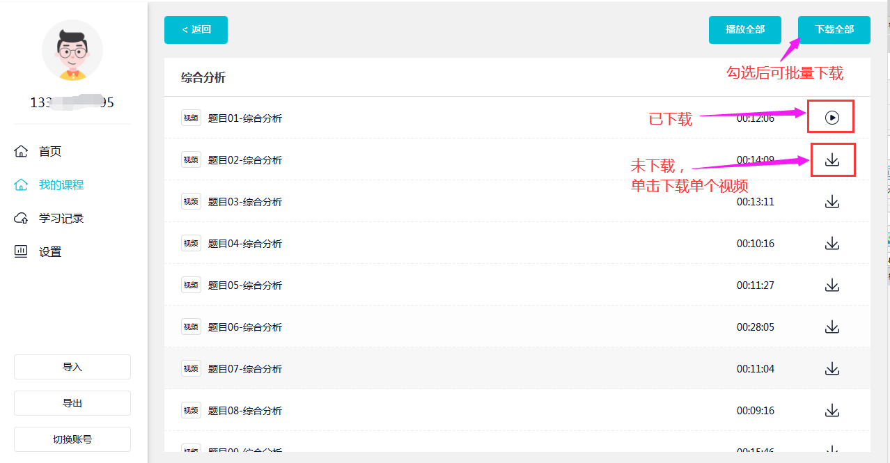 (2)点击学习进入视频课列表,下载视频后可在APP内观看,点击“下载全部”支持批量课件下载。