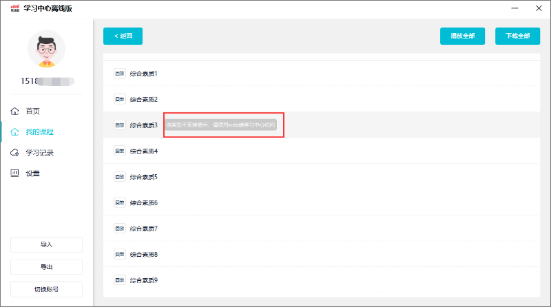 (4)离线播放器暂不支持观看直播课、回放视频等操作,点击课程播放时会提示该类型不支持显示,请使用浏览器在线观看。