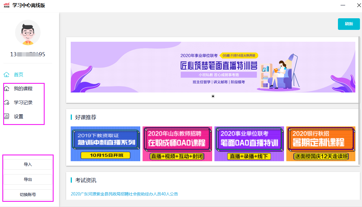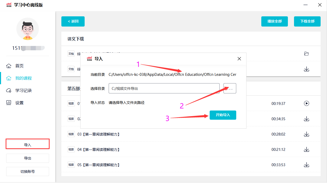 (4)导入:可通过之前下载保存的视频文件(注:电脑上离线客户端下载的视频课件)导入到另一台电脑上(需安装离线客户端);