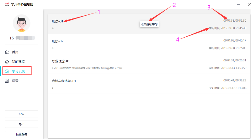 点击界面左侧学习记录标签页,打开学习记录界面,点击该条记录可打开视频播放界面,并按照上次观看进度继续播放该视频。