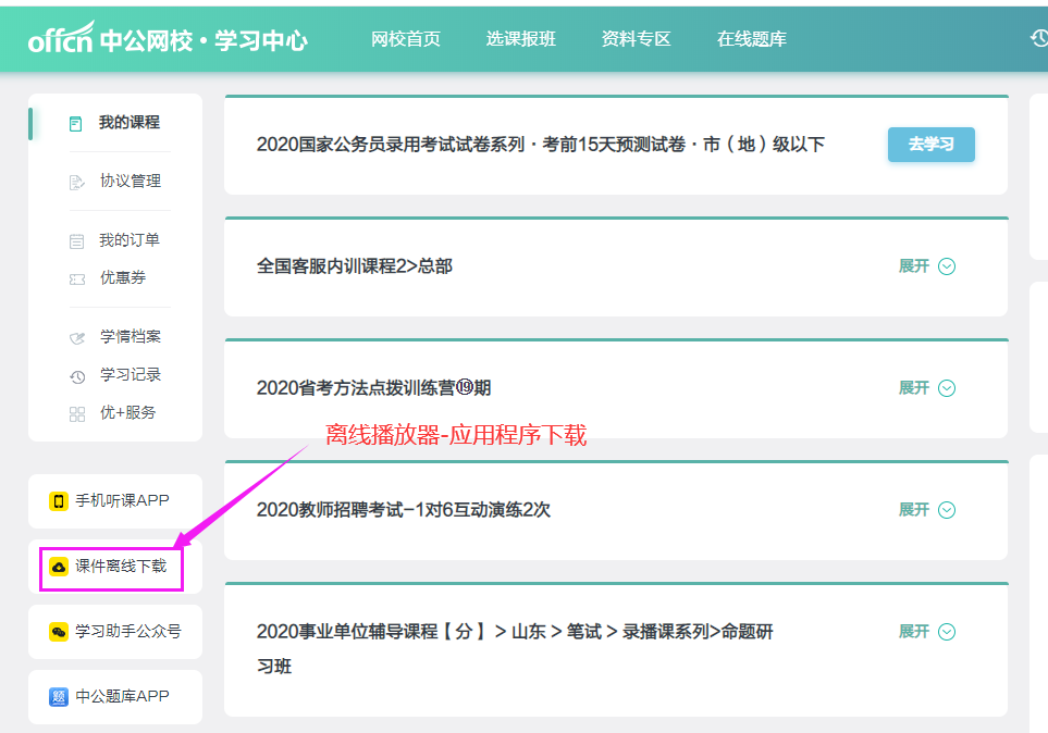 方法二:电脑登录中公网校学习中心(http://xue.eoffcn.com/web/),点击左侧的“课件离线下载”,进行下载安装。