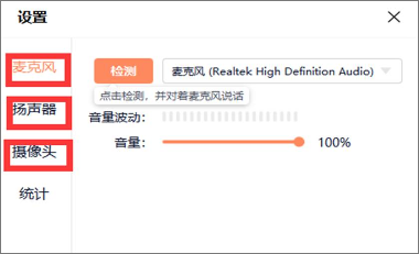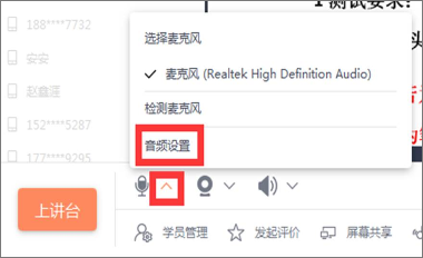 (1)操作:进入教室后点击左下角麦乐风旁边的下三角,“音频设置”里即可进行设备检测