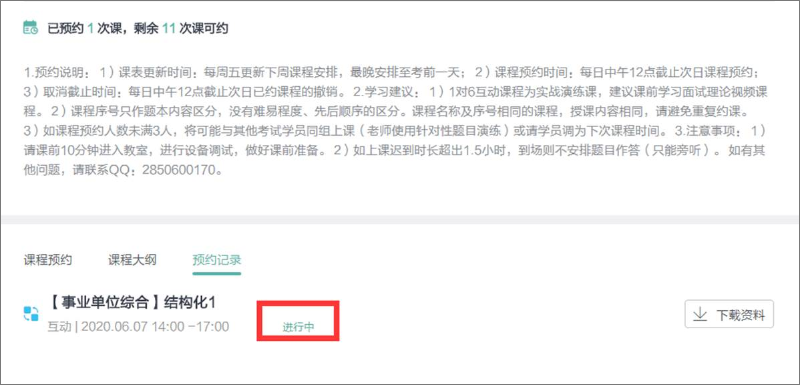 操作方法:登录进入"互动课程首页",从"预约记录"中可以查看已经上课的课程记录,每次课程记录中可以显示参加的练习日志和下载本次课程的场外题目。