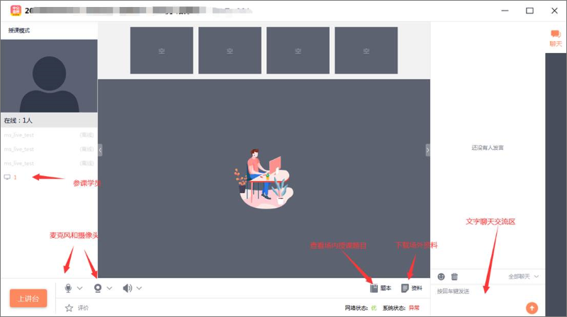 登录后,教室显示为如图形式,教室内布局及功能详解: