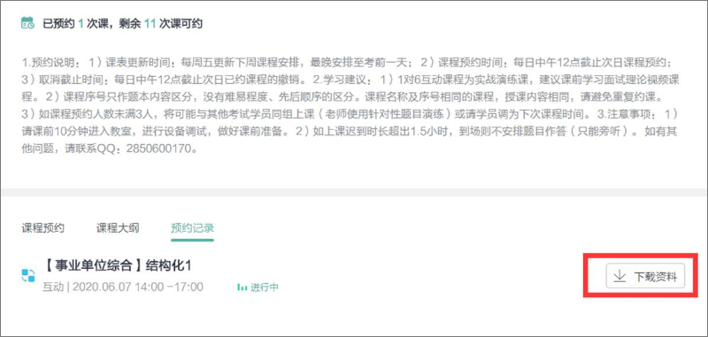 操作方法:课程结束后,包含场外题目的课程可以在该课程“下载资料”处下载场外的题本和答案,(授课老师也会在课程中上传,此处的场外资料与授课老师所传的场外资料相同),请注意下载链接只有30天的有效期,请及时下载相关资料。