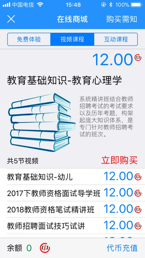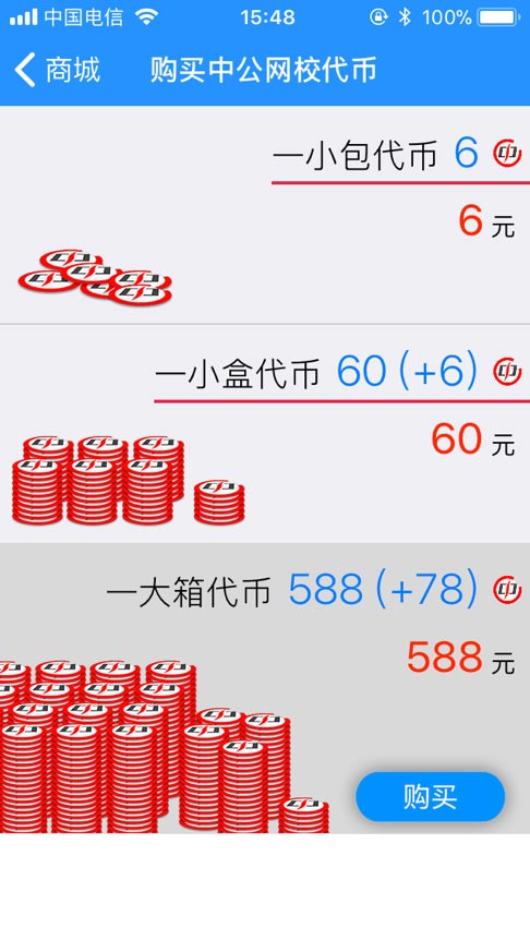 用户可以通过App内购来获取中公网校代币并自助购买课程。代币方式支付的课程不支持退费,如有课程选购需求,建议登录www.eoffcn.com选购课程。